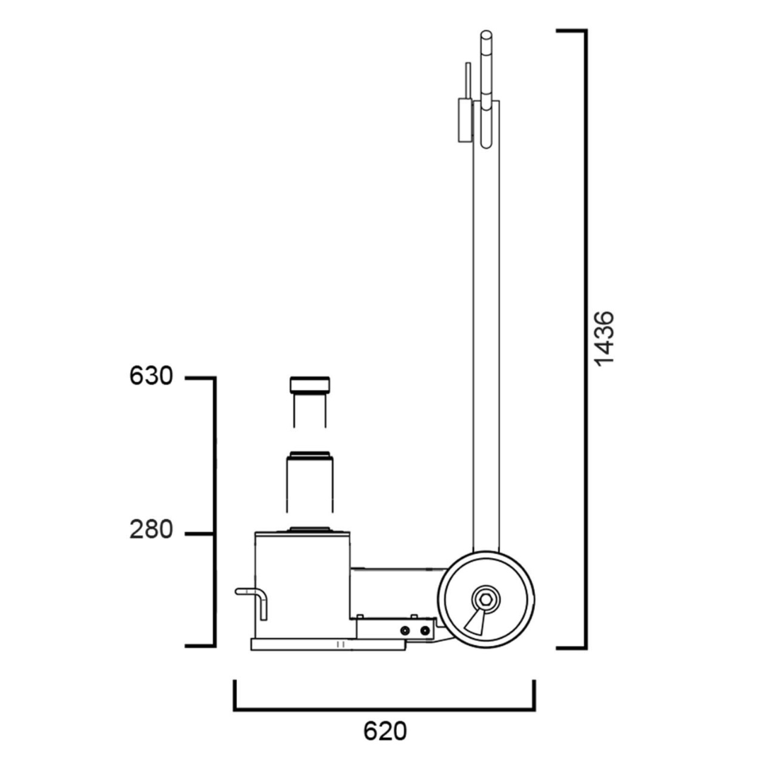 ג’ק אוויר-הידראולי דו-בוכנתי, גובה 280-630 מ”מ, לחץ עבודה 9-12 בר. פתרון לרכבי משא וצמ"ה כבדים וגבוהים במיוחד כולל תוספת הגבהות.